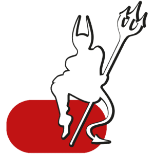 Weißes Teufel-Logo mit Dreizack auf rotem Kreis, Symbol für KOSIS Bar, Essen, Nightlife